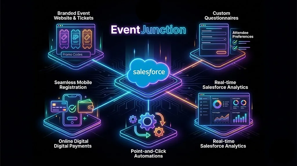 EventJunction is a Salesforce-native Event Registration app for businesses hosting events. From offering multiple ticket types on a branded event website with support for promo codes to customizing questionnaires tracking attendee preferences per event, each stage of the event lifecycle is managed within Salesforce. Mobile-optimized registration experience with online digital payments enable seamless attendee engagement with point-and-click Salesforce automations to manage the event workflow. Get real-time event insights through Salesforce Analytics and avoid the clutter and constraints of 3rd party connectors and integrations.